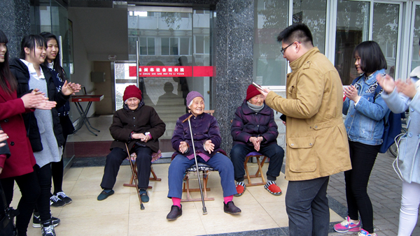 徐州市社会福利院前身为老残教养院,主要担负着徐州市区“三无”老人的养护、康复、托管及医疗教育工作。同学们先听完福利院刘主任的介绍后,来到老年公寓,看望住在这里的老人们,帮助他们整理房间,给老人们揉揉肩、捶捶腿,和老人们聊聊天,初步建立起融洽的感情。然后同学们来到户外,大家载歌载舞,给老人们带领了精彩的节目表演。看到朝气蓬勃、热情四射的大学生们,老人们非常高兴,脸上露出了真心的笑容。一下午的时间很快过去了,老人们依依不舍地和同学们告别。福利院刘主任对学生们的表现给予了高度的赞扬,对学校组织的志愿服务活动表示感谢。