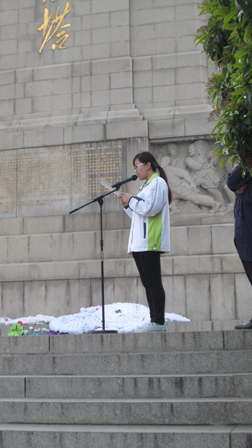 在庄严的国歌声中,悼念仪式正式开始,学生代表向烈士们敬献花圈,全体成员面向纪念碑庄严肃立,默哀三分钟,以表达对革命先烈的崇高敬意和哀悼之情。随后,学生代表王翊同学宣读了沉痛的悼词,号召同学们弘扬民族精神,践行文明和谐、自由平等、爱国敬业的社会主义核心价值观。最后,全体成员绕塔一周瞻仰革命先烈纪念碑。