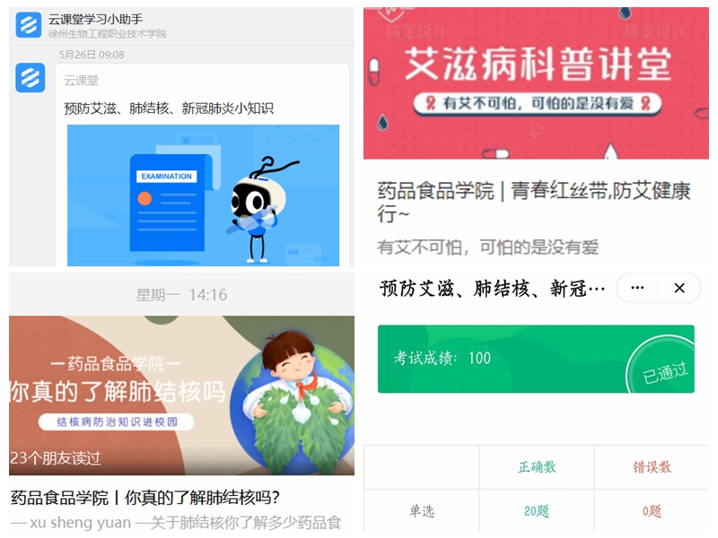 我院以“青春红丝带,健康教育行”班会课为主要形式,以“预防艾滋、肺结核、新冠肺炎小知识”钉钉线上考试为抓手,深入开展线下教育。并通过悬挂条幅,制作微信推送等开展形式多样的健康知识宣传教育,引导学生掌握预防艾滋病和结核病的基本知识和基本方法,使学生真正认识到文明、健康、有序地生活的重要性。活动后,同学们纷纷表示,今后一定会加强对防治结核病、艾滋病知识的学习,增强其自我保护意识和抵御艾滋病侵袭的能力,并积极参与到结核病与艾滋病防治宣传中来,向家人和朋友宣传结核病与艾滋病防治知识,为结核病与艾滋病防控贡献自己的力量。