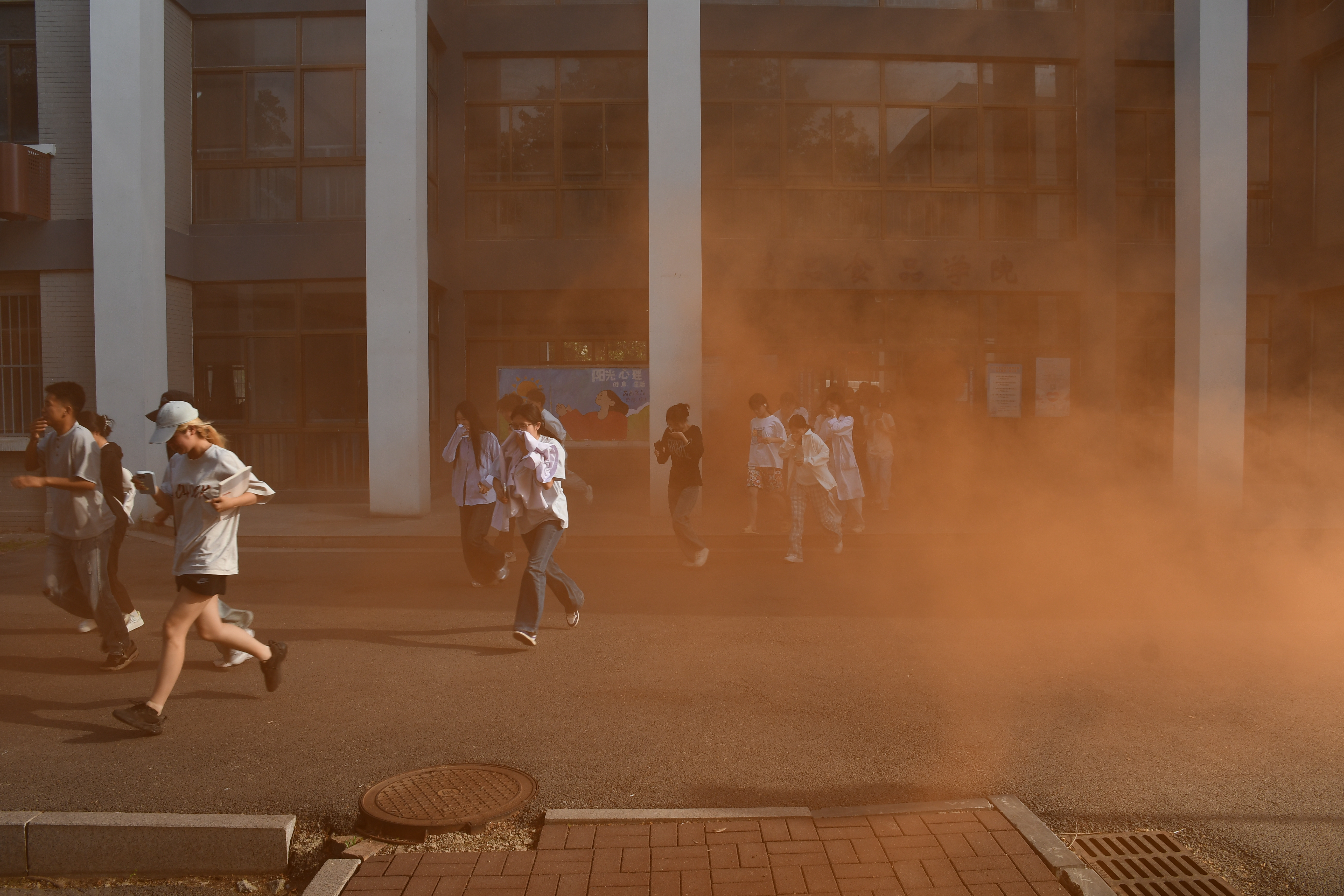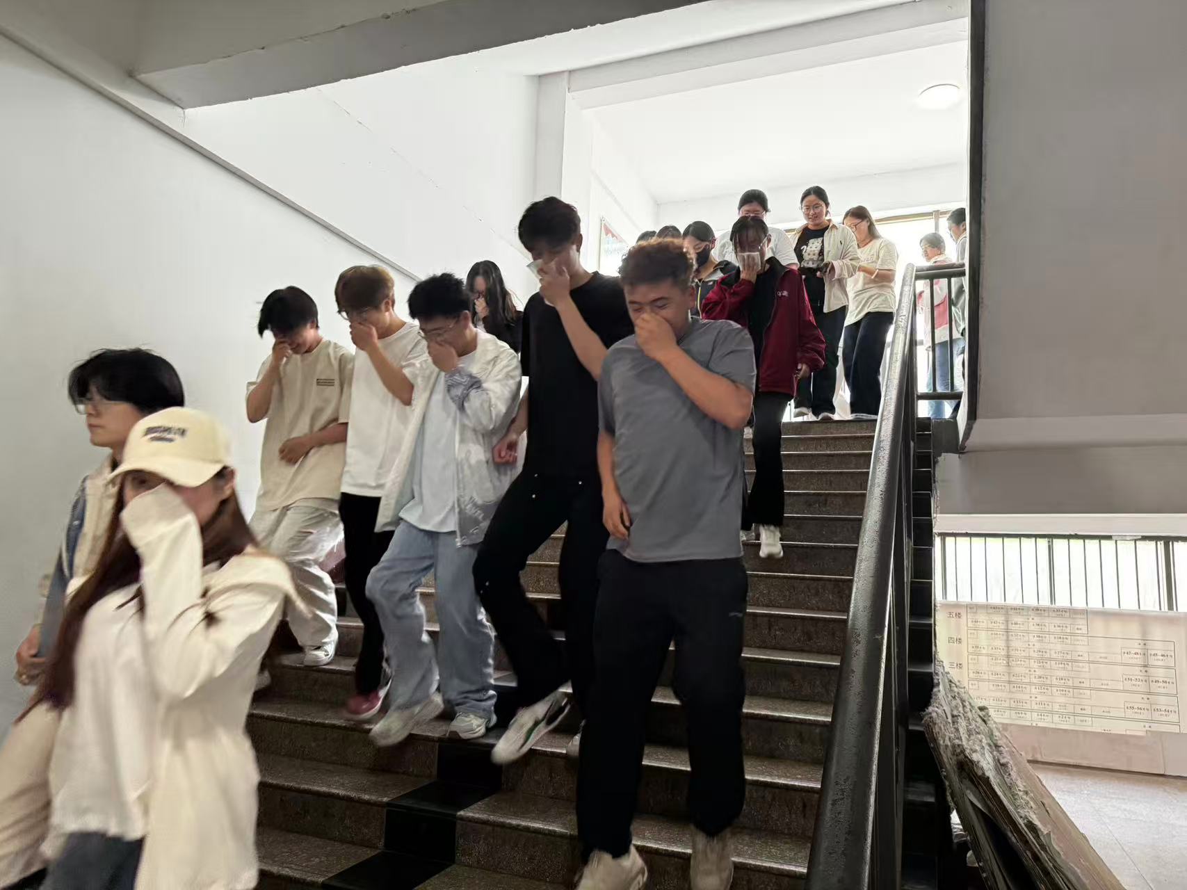 随着警报声的骤然响起,1 号教学楼内的师生迅速进入应急状态。各负责人第一时间到达指定岗位,引导学生按照预定的疏散路线,用湿毛巾捂住口鼻,弯腰低姿,快速而有序地撤离教学楼。整个疏散过程中,师生们反应迅速、行动有序。