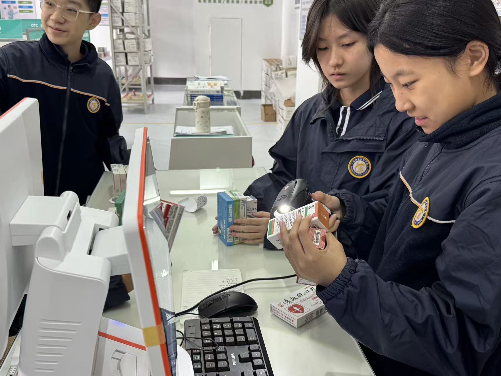 在模拟药房区域,研学活动进入了互动高潮。同学们化身“小小药剂师”,亲身体验了从审方、调配到扫码“卖药”的全流程。这套高度仿真的实践操作,让课本上枯燥的理论知识瞬间变得生动可感。同学们在“玩”中学,在学中“做”,不仅了解了药品管理的严谨性,更对药学工作者的职业内涵有了初步的认知。