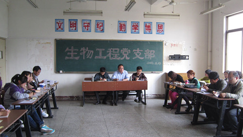 2014年4月14日下午,生物工程党支部在3号教学楼313室召开了支部大会,集中学习了习近平总书记《在党的群众路线教育实践活动工作会议上的讲话》和2014年1月1日《人民日报》的社论《扎实开展第二批教育实践活动努力取得人民群众满意的实效》两份材料。会议由生物工程党支部张韧书记主持,支部全体党员出席了会议。