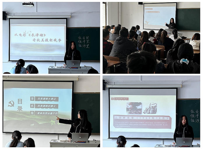 为切实增强党史学习教育实效,让红色基因、革命薪火代代传承,10月10日下午,我院辅导员以电影《长津湖》看抗美援朝战争为主题为学生上了一堂精彩生动的思政课。孙老师以热映电影《长津湖》为切入点,从抗美援朝的背景、过程、影响以及保家卫国精神永传承四个篇章,层层递进,详细讲解。学生们认真聆听,细做笔记,如潮的掌声不断响起,现场气氛热烈。同学们纷纷表示,要传承红色基因,坚定理想信念,努力成为建设伟大祖国的栋梁之才,在新时代放飞青春梦想!
