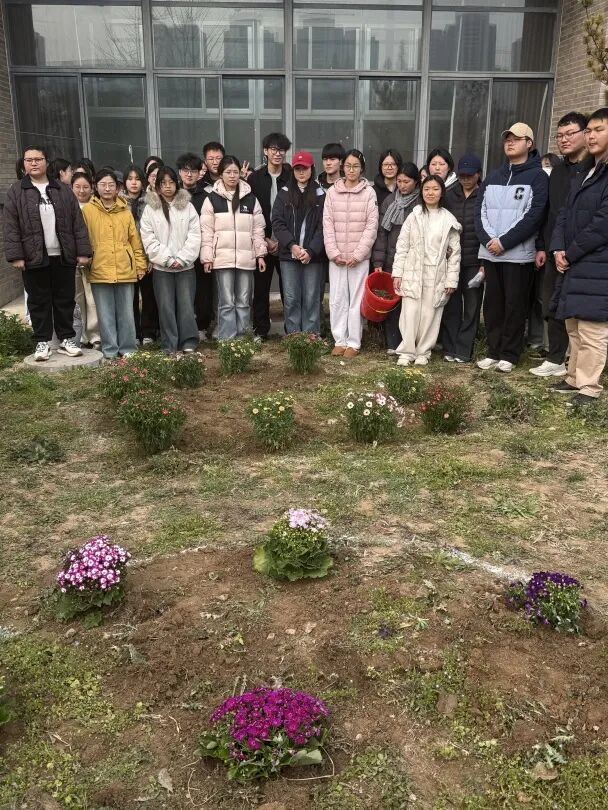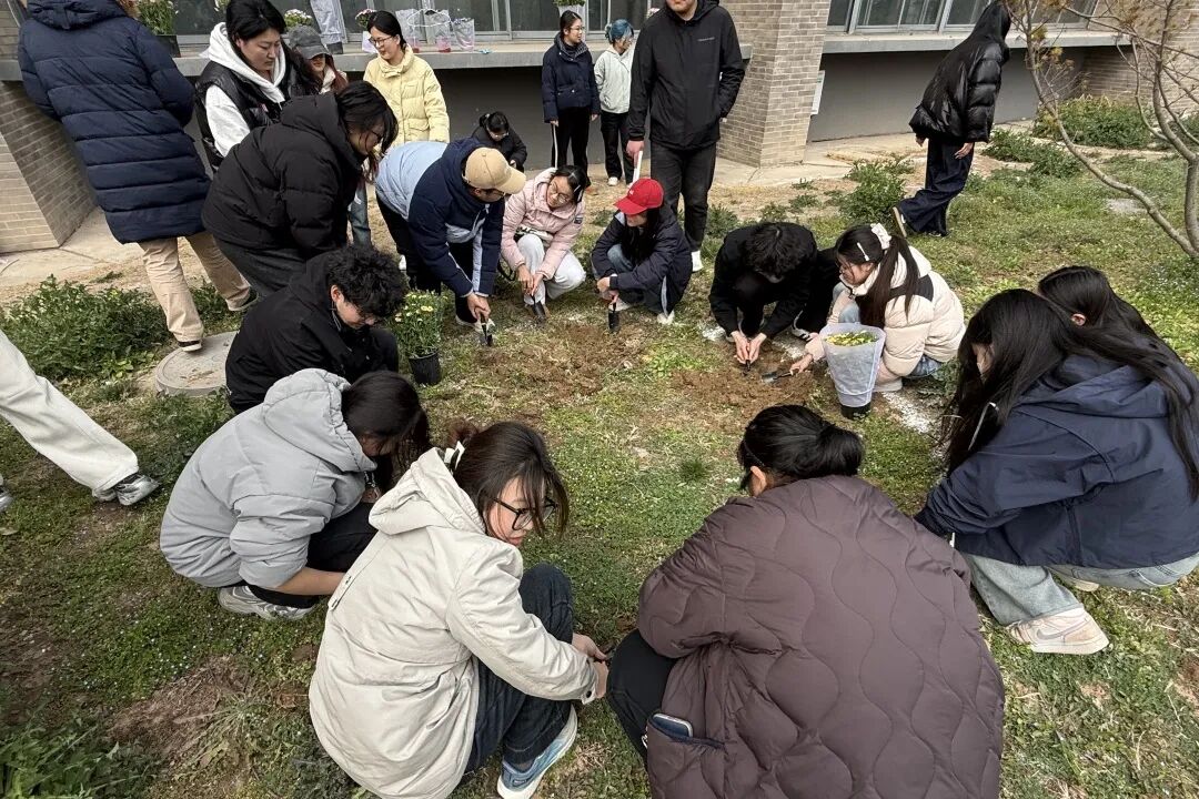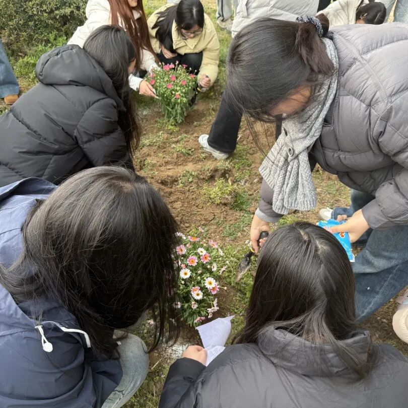 春风拂过,草木萌动。同学们从课堂上的植物科普,走到户外的亲手栽种,用小铲翻开泥土,将一盆盆带着花苞的绿植小心埋下。